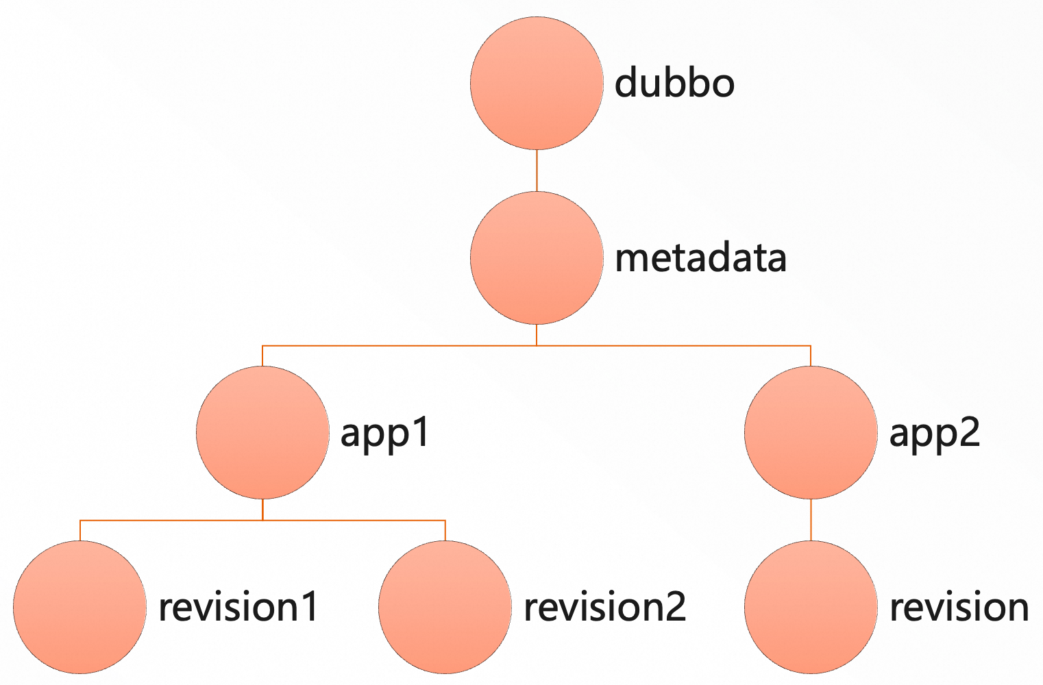 在应用级服务发现中,zookeeper 注册中心还会存储一份额外的元数据,用于解决 接口名到应用名 之间的映射关系,其存储结构如下: